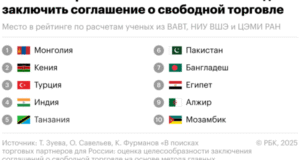 Наиболее выгодные России для свободной торговли страны. Инфографика Тройку наиболее выгодных России стран для свободной торговли возглавила Монголия Монголия, Кения, Турция являются странами, с которыми России наиболее выгодно заключить договор о свободной торговле. Это следует из статьи «В поисках торговых партнеров для России: оценка целесообразности заключения соглашений о свободной торговле на основе метода главных компонент», опубликованной в журнале «Вопросы экономики» ...