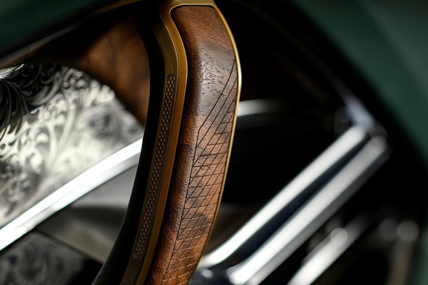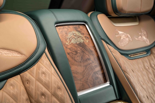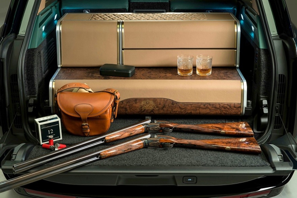 В багажнике друг над другом размещены два кофра ручной работы из кожи и дерева. В верхнем кофре хранится набор для распития шампанского на восемь персон — хрустальные бокалы, штопор из оленьего рога и скатерть с вышивкой ручной работы. В нижнем кофре есть отсек для хранения двух дробовиков Holland & Holland и набор для распития виски — восемь стаканов, графин, две фляжки в виде патронов и скатерть. Короче говоря, складывается такое ощущение, что охотники едут на природу в основном пить, нежели стрелять в птичек.