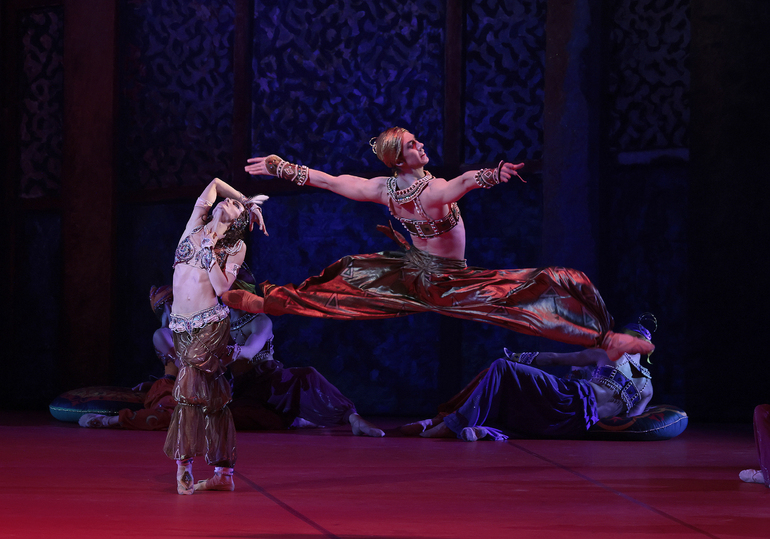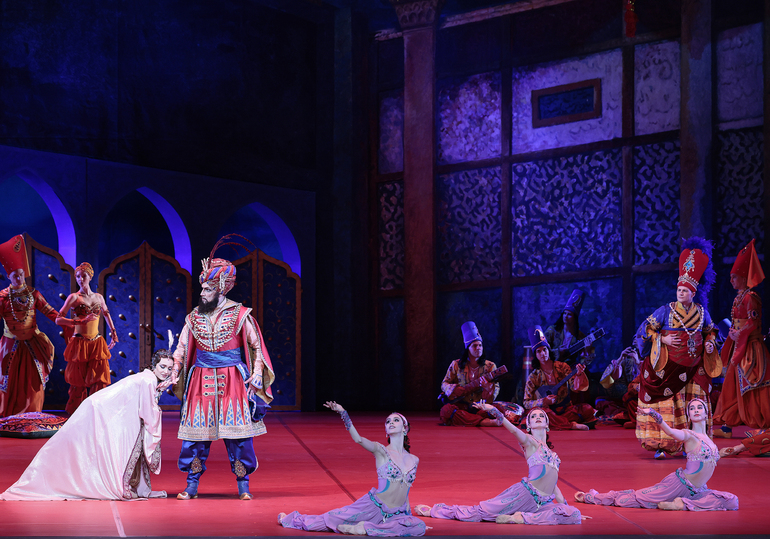 Зобеида — Юлия Степанова. Шахрияр — Андрей Ситников. Одалиски — Дэйманте Таранда, Ангелина Влашинец, Таисия Коновалова. Сцена из спектакля «Шехеразада». Фото Дамира Юсупова/ Большой театр.