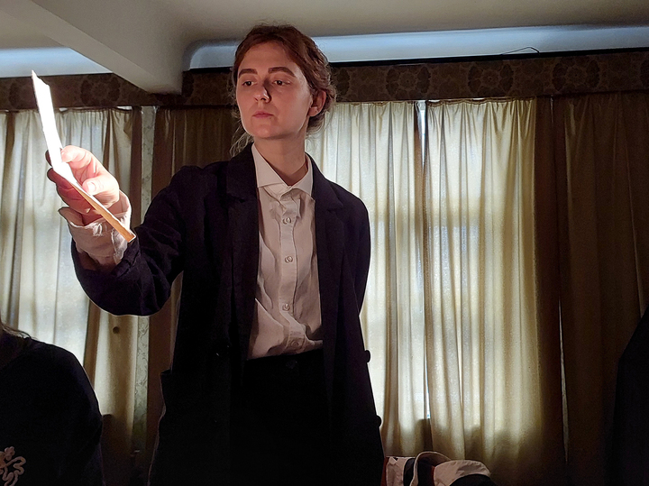 Всю эту тревожную переписку на протяжении действа, идущего менее часа, складывает в серебряную шкатулку жена Немировича-Данченко Екатерина  фон Корф в исполнении единственной и безымянной актрисы спектакля Ивана Пачина. Она все приберегает для истории.  Все новые и новые документы и свидетельства эпохи она раскладывает перед зрителями на столе.