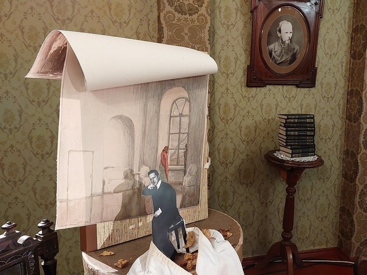 На столе разложены копии эскизов Мстислава Добужинского, созданных к спектаклю Московского Художественного театра «Николай Ставрогин» 1913 года по роману «Бесы» Достоевского.  Собственно к 150-летию со дня рождения выдающегося художника и создана инсталляция в Старой Руссе. Сам он  представлен не только своими работами, но письмами, прочитанными современными актерами, миниатюрной бумажной фигуркой, установленной на рояле.