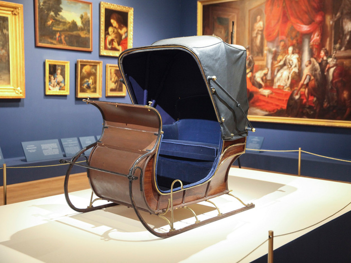 «Карету мне, карету!» — если мысленно вспомнить здесь цитату из «Горя от ума», а потом немного пройтись по залам, то можно представить себя Чацким и умчаться восвояси… А если без шуток, то три кареты, привезенные в стены ГИМ, были чуть ли не самыми обсуждаемыми экспонатами еще до начала выставки. Милая детская двухместная коляска, которую Екатерина Великая приобретала для младших внуков, детские беговые сани, на которых в детстве катался будущий последний император Николай II, а затем его сын Алексей. Цесаревичу, кстати, в сани запрягали ослика Ваньку, которого наследник очень любил. Наконец, одноместные сани Павла I с шелковой сеткой, защищавшей пассажира от летящего из-под копыт коней снега. Всего три изысканных транспортных средства, которые по стоимости были на уровне современных люксовых автомобилей, а по внешнему исполнению вполне относились к произведениям «транспортного» искусства.