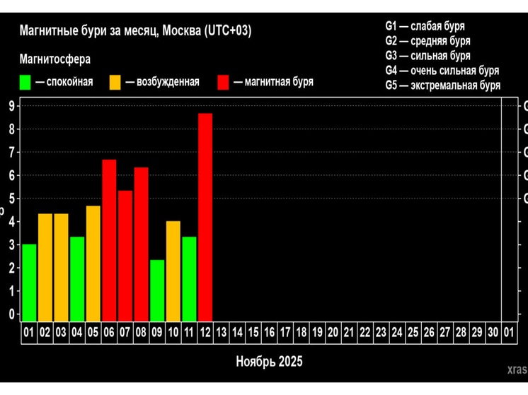 Напомним, что мощная магнитная буря бушует на Земле после нескольких вспышек на Солнце, самые сильные из которых произошли 9, 10 и 11 ноября. Буря началась 12 ноября, примерно в 3 часа ночи по московскому времени и к 7 часам достигла почти максимального значения – G4, но специалисты ожидают во второй половине дня усиление геомагнитного возмущения до наивысшего значения – G5. Кроме самих вспышек класса Х наблюдаемое событие связано еще с мощными потоками солнечных протонов, которые достигли Земли.