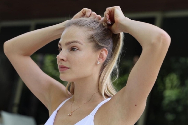 Стройняшка Клишина встала на колени в бикини и показала рельефный пресс