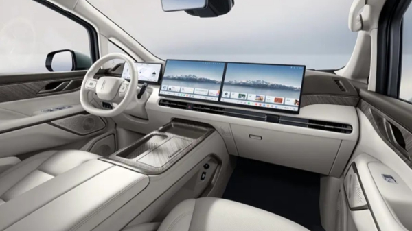 Главные перемены произошли в семиместном салоне минивэна. Если у российского Wey 80 Premium на передней панели установлены два экрана (12,3-дюймовый для приборов и 14-дюймовый для мультимедийной системы), то новый Gaoshan 7 в дополнение к той же цифровой приборке получил кластер из двух дисплеев диагональю по 15,6 дюйма каждый с разрешением 2.5K и проекционный экран, который в России для варианта Premium недоступен. Кроме того, заявлены монитор на потолке для задних седоков, специальный бокс с возможностью подогрева и охлаждения, складные столики, беспроводная зарядка и электронный селектор трансмиссии.