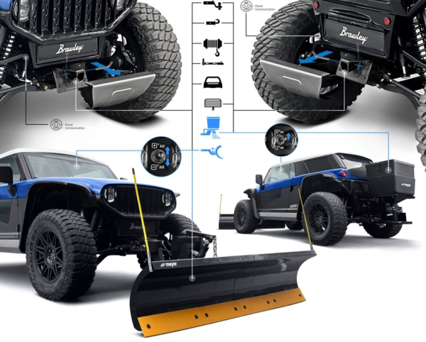 Силовая установка состоит из четырёх электромоторов (по одному на каждое колесо), их максимальная совокупная отдача — 297 кВт (404 л.с.) и 662 Нм. Четыре электромотора в сочетании с задней поворотной осью наделяют Brawley завидной манёвренностью: есть режимы eCrab (способность ехать вбок по диагонали) и eTank (способность развернуться на месте за счёт вращения в разные стороны колёс по левому и правому бортам). Ёмкость батареи — скромные 40 кВт·ч, запас хода на одной зарядке — 225 км. Весит вездеход от 1225 до 1360 кг в зависимости от оснащения. Допустимая масса буксируемого прицепа — 680 кг.