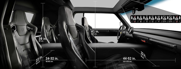 В салоне Brawley установлены четыре индивидуальных ковшеобразных кресла с четырёхточеными ремнями безопасности и подогревом, есть климат-контроль и аудиосистема с четырьмя динамиками (в виде опции предлагается сабвуфер). Щиток приборов — это два стрелочных циферблата. Мультимедийного экрана нет, все функции активируются тумблерами на передней панели и под потолком. В нижней части дверей и в крыше предусмотрены смотровые окна. Объём багажника — 470 л.