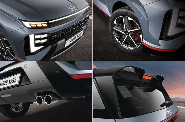 Так, у Venue N Line другая, более узкая радиаторная решётка с рисунком из иных полых горизонтальных штрихов и шильдиком с названием версии сбоку. Под узкой светящейся линией, которая соединяет фары через всю ширину передней части, тоже есть дополнительные горизонтальные штрихи. Ещё у такого паркетника иначе оформлена нижняя часть заднего бампера с интегрированным в него воздухозаборником.