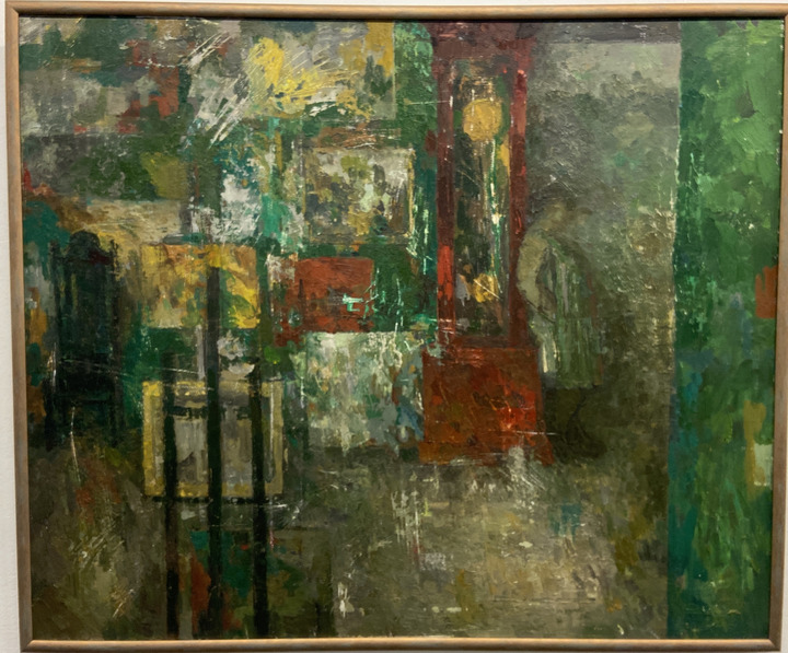 Аналогичный эффект, когда не сразу понимаешь сюжет, на «Автопортрете с красными часами», работа тоже из недавних, 2024 года, не окончена. И в центре внимания художницы не она сама, хотя и называется картина «Автопортрет». Нас фокусируют на интерьере — мольберт на первом плане, за ним — множество картин в подрамниках и без, а рядом — элегантные старинные часы с маятником. Где же художница? Ее мы едва замечаем (снова лишь отойдя назад) в дверях, облокотившись на часы. Оптический обман да и только.
