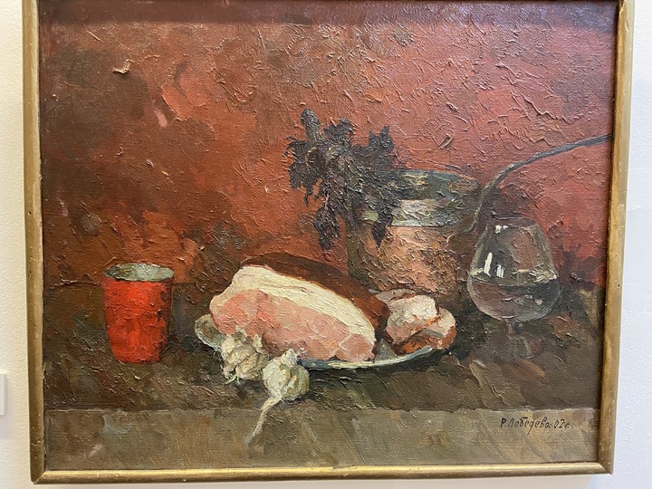 Еще со студенческих лет Раису Ивановну вдохновлял Илья Машков, чья выставка гремит в Третьяковской галерее. Китч в хорошем смысле этого слова, свойственный Илье Ивановичу, встречается и на работах Раисы Лебедевой. Если у Машкова это были фарфоровые фигурки, соседствующие с огурцом, то у Лебедевой — ветчина с чесноком возле фужеров.