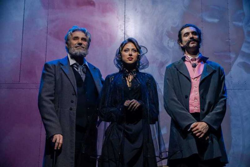 Луиза Симон-Деманш (Кристина Айвазовская) с молодой и пожилой версией Сухово-Кобылина (Рашид Казиев, Юрий Голубцов). Фото: Предоставлено театром «У Никитских ворот»