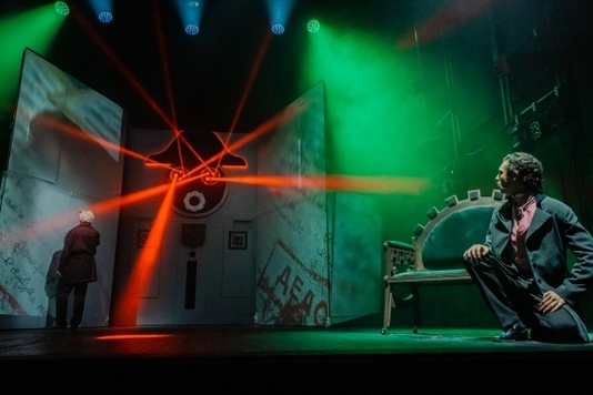 Еще об одной фишке спектакля стоит сказать: Марк Григорьевич обещал недавно написать совместно с нейросетью музыку. По факту в первой премьере сезона ИИ уже активно используется: на фоновый экран, перегораживающий сцену, проецируются облики демонических сущностей, там же «оживляются» отдельные персонажи, Гегель, учением которого увлекается Сухово-Кобылин, плюс упоминаемый в спектакле Михаил Щепкин (игравший в 1855-м году в Малом театре помещика Муромского из «Свадьбы Кречинского»).