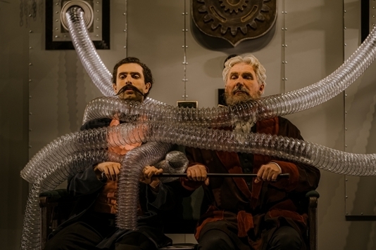 Но и это не самое главное. После антракта в целом реалистическая пьеса, наполненная пустяковыми деталями, – вот русские любят щи, чтобы ложка стояла, малосольные огурчики и водку, а французы – водянистый суп и шампанское, вот они не могут русскую букву «Щ» произнести — превращается в фантасмагорию. И Розовскому нужно отдать должное – в кровососущую машину со зловещими глазами-прожекторами, горящими красным и длинными алчными щупальцами-«хоботками», как в голливудском фильме о кровопийцах-марсианах, его команда явно вложилась. В начале спектакля ничего подобного не ожидаешь, даже после первых упоминаний об «оборотнях, сосунах, вуйдалаках» (коррумпированных и просто надеющихся выслужиться по итогам скандального дела чиновниках). Но сцена буквального кровососания из тел героев (хорошо, хоть алая жидкость не идет по трубам) есть один в один в «Смерти Тарелкина», где описывается монстр-упырь, питающийся «теплою… человеческою крррровью»: