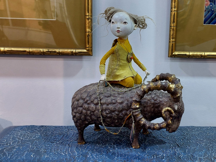 Красавицы наездницы представлены в самых разных ипостасях. Одна из них, еще совсем маленькая, сидит верхом на барашке. В «Принцессе» и «Легенде» тоже запечатлены прекрасные всадницы верхом на фантастических единорогах. С ними связано множество бурятских легенд и аллегорий. В интерпретации семьи Намдаковых единорог предстает в образе небесного белого коня, обладающего магической силой.