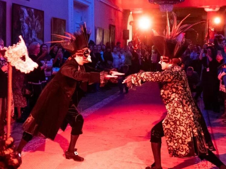 Перед началом спектакля ни о чем не подозревающие зрители привычно перемещаются по фойе в ожидании, когда же откроются двери Колонного зала Шаховской. Двери на самом деле приоткрываются, однако никого в зал не приглашают. Зато фойе начинает заполняться удивительными фигурами: прекрасные дамы и кавалеры в черных нарядах, причудливых головных уборах и венецианских масках пускаются в изысканный танец. Фойе волшебным образом превращается в карнавальное пространство, в котором всем заправляет баронесса Франческа (Ксения Лисянская). Она рассказывает одну из венецианских легенд – о прекрасной девушке Паоле, которая видела свое отражение лишь в кривых зеркалах и поверила в свое уродство. Артисты – Вагиф Турабов, Кристина Мунтяну и Николай Пацюк – разыгрывают эту интермедию в духе комедии дель арте. Звучит музыка Респиги, Джезуальдо, Генделя, которая погружает зрителей в эпоху барокко, а контртенор Вагифа Турабова заставляет вспомнить о традициях кастратного пения. Эффект погружения настолько силен, что, переместившись в зал Шаховской, публике несложно воспринимать модернистскую партитуру ХХ века в русле барочной стилистики.