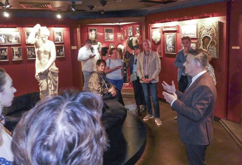 В центре «мягкой карусели» установлена старинная статуя, доставшаяся музею, как рассказал директор Кирилл Крок, со времен бывшего владельца театрального особняка Берга — именно она выступает в роли «экскурсовода». Стены — экран, на котором смотришь объемный видеоролик, как в планетарии: история театра в сюжете отсчитывается от стрелецких казарм, которые стояли на этом месте в старой Москве XVI века. Правда, стены оказываются створчатыми, их «распахивают», и, о чудо, внутри все заполнено экспонатами… продолжающими рассказ. И о событиях послевоенных десятилетий мы узнаем от имени говорящего с немецким акцентом осколка фугасной бомбы, сброшенной фашистами и погубившей в ночь с 23 на 24 июля 1941 года двух артистов и работника театра.