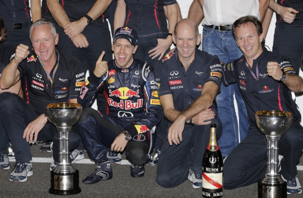Джонатан Уитли (крайний слева) отмечает победу Феттеля в чемпионате Ф-1 2012 года / Фото: AP
